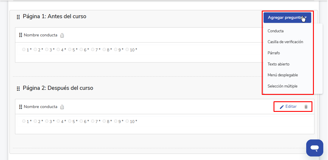 - Conduta: Escala de 1 a 10 para medir o cumprimento de uma conduta esperada. Essas perguntas são repetidas, automaticamente, em ambas as páginas. Ou seja, mede-se a mesma conduta antes e depois do curso.