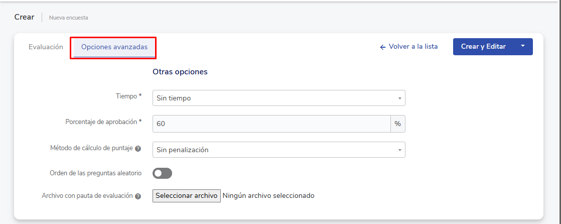 - Archivo con pauta de evaluación: Você pode anexar um PDF que será mostrado no início da avaliação.