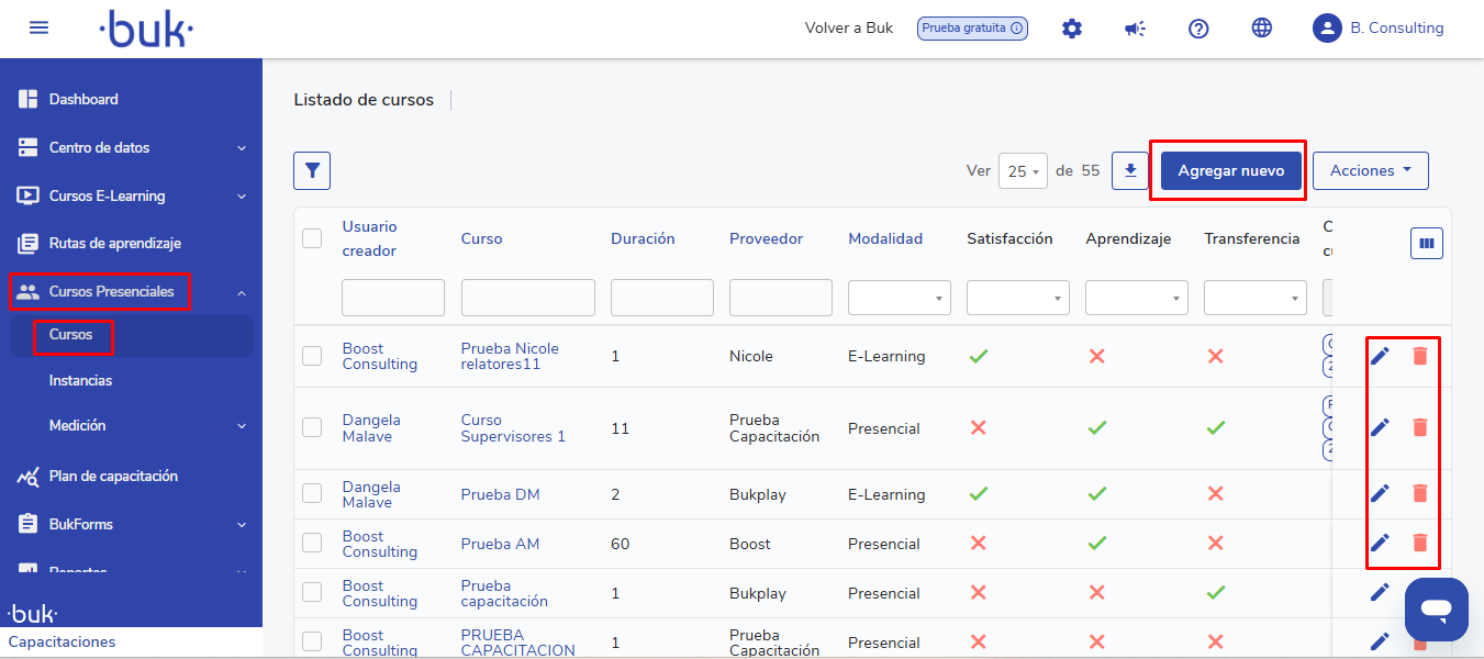 - Nesta vista você encontrará uma lista com todos os cursos criados. Na última coluna poderá editar ou excluir um curso.