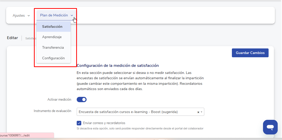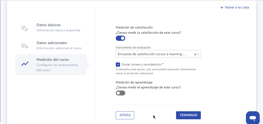 Aqui você poderá ativar os tipos de medição do curso. Poderá configurar os instrumentos de avaliação que desejar utilizar (devem estar previamente criados) e ativar o envio de e-mails e lembretes. As opções disponíveis são medição de satisfação e de aprendizagem.