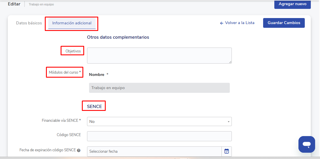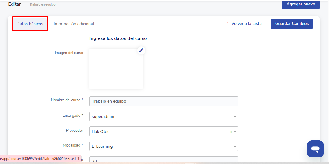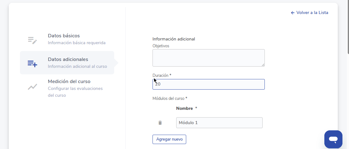 - Módulos: Você pode adicionar um ou mais módulos com o botão Adicionar nuevo ⚠️Uma vez finalizada a criação do curso, os módulos não podem ser editados nem excluídos