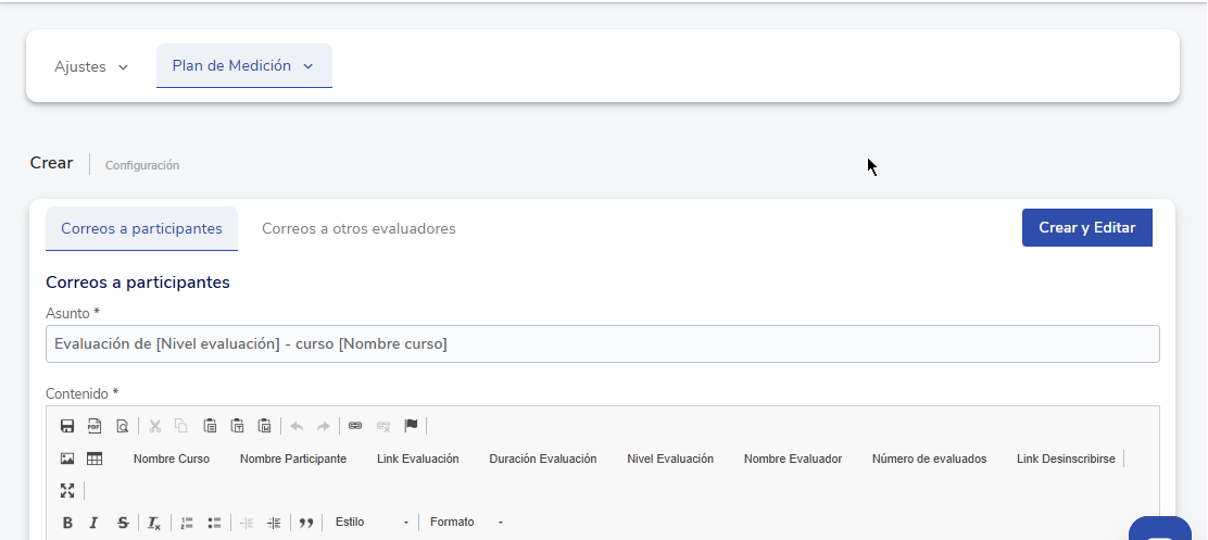 ✉️ Configuração de e-mails:Na seçãoConfiguração,dentro da aba Plano de medição, você poderá personalizar o conteúdo dose-mails de inscrição e lembreteaos participantes e outros avaliadores.