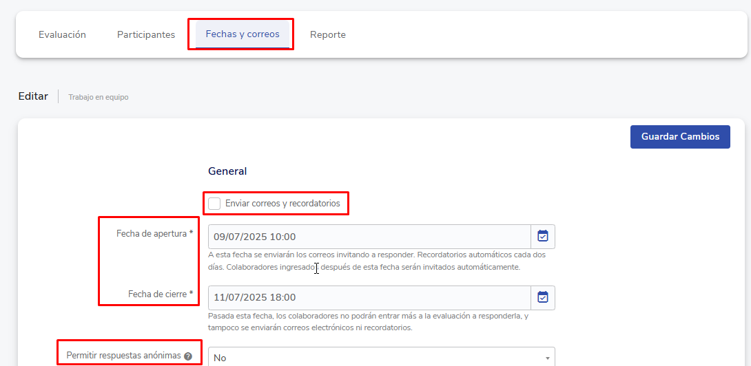 A seguir, é exibida uma visualização com diferentes abas, que permitem a gestão de participantes, configuração de datas e e-mails de lembrete e visualização de relatórios (uma vez que tenham sido recebidas respostas por parte dos colaboradores).