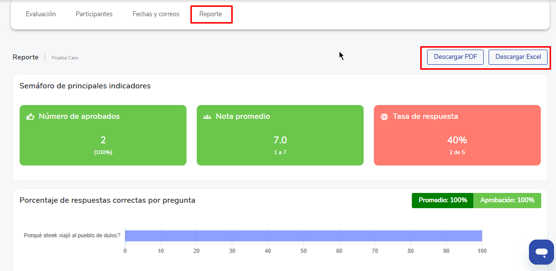 3. Relatórios:Na aba de relatórios você poderá visualizar e baixar os resultados gerais da avaliação e por pergunta, em formato PDF (com gráficos) ou Excel.