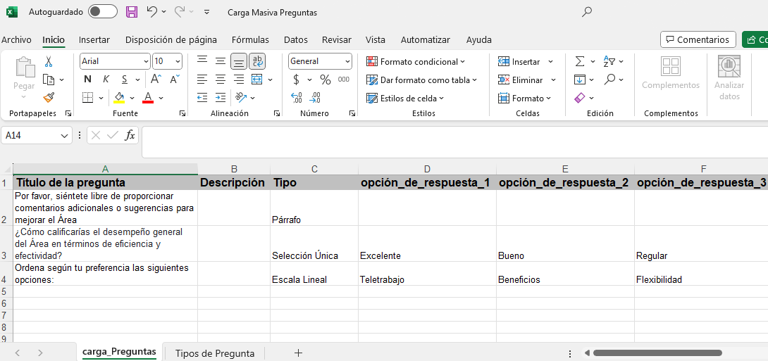 Na aba “Carga_preguntas” do arquivo Excel, você deverá inserir o conteúdo correspondente: o título da pergunta, uma descrição opcional, o tipo de pergunta e, se necessário, as opções de resposta. Você pode se apoiar na aba “Tipos de pregunta” como referência para preencher corretamente a coluna de tipo.