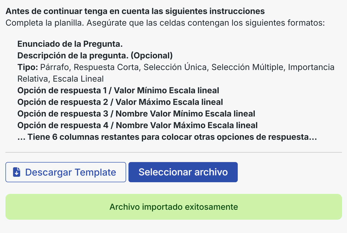 Uma vez finalizada a edição do arquivo, volte para a janela de importação e selecione o arquivo clicando no botão “Selecionar arquivo”. Se o formato estiver correto, você verá uma mensagem de confirmação em cor verde e as perguntas serão carregadas automaticamente no formulário.