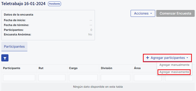 Quanto à carga em massa de participantes, uma vez que o formulário de perguntas esteja pronto e as mensagens de notificação tenham sido configuradas, salve as informações para continuar. Em seguida, clique em “Adicionar participantes” e selecione a opção “Adicionar em massa”.