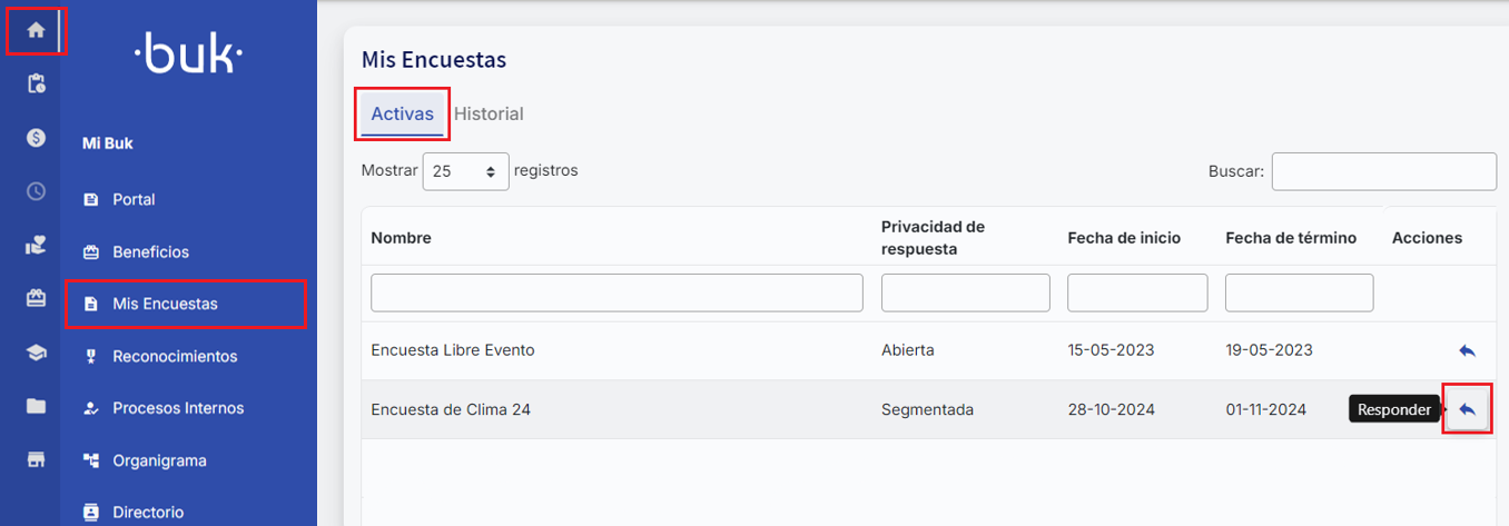 Você também pode acessar a pesquisa diretamente pela plataforma. Para isso, vá em "Minha organización" e selecione "Minhas pesquisas". Na aba "Ativas" você encontrará as pesquisas que estão pendentes de resposta.