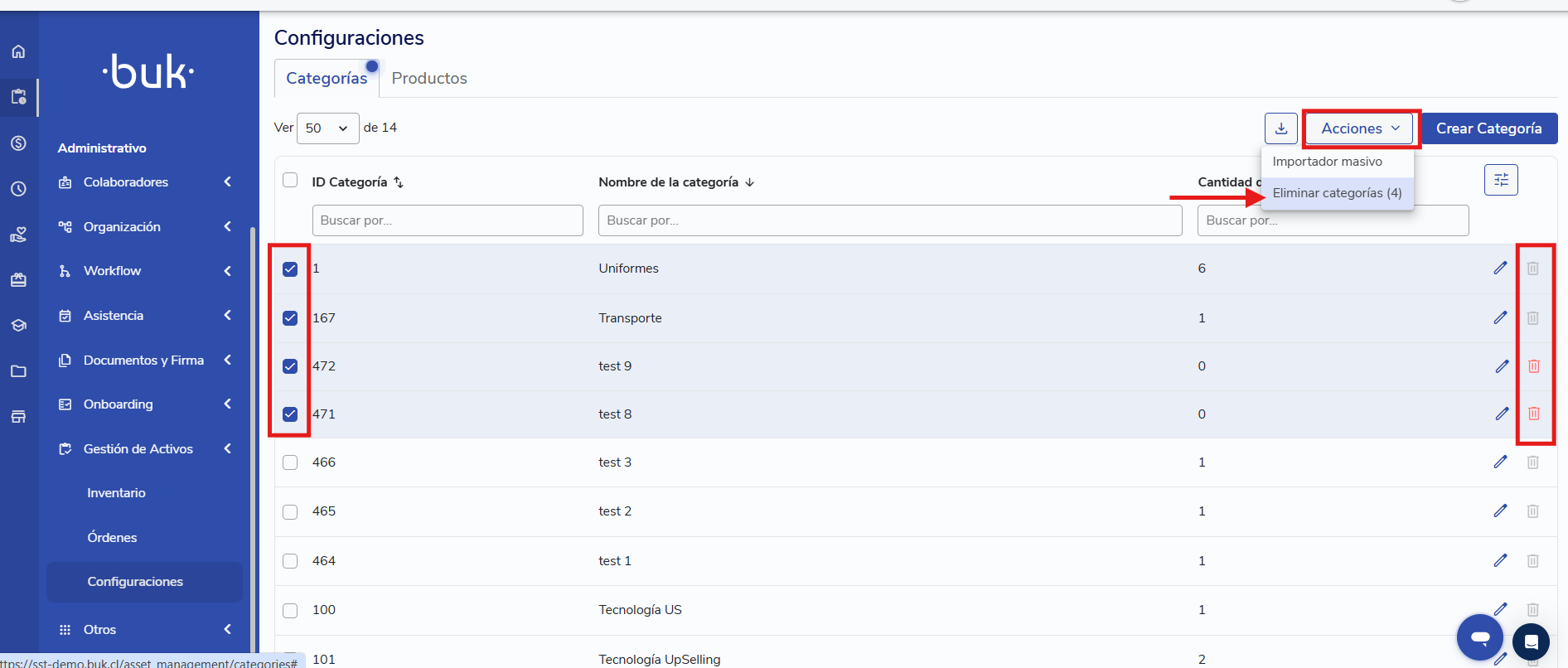 Para excluir categorias em massa você deve: