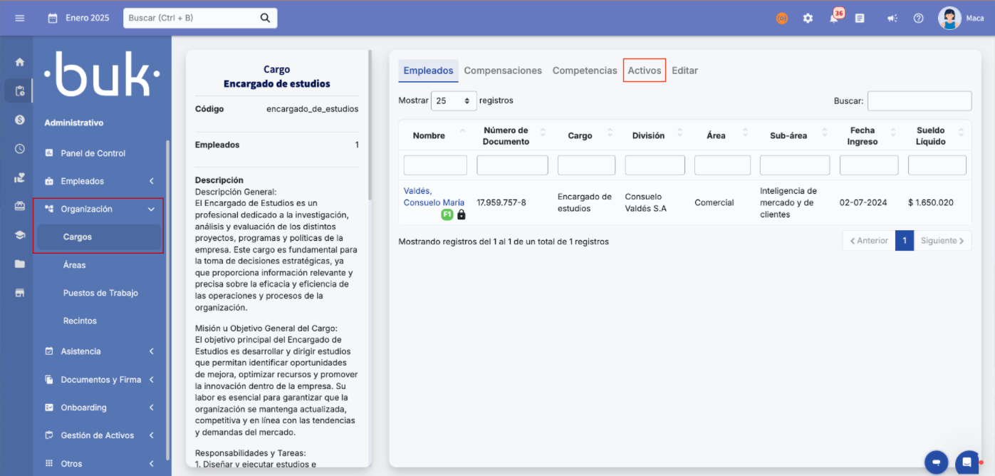 - Ao clicar na aba de Ativos, serão listados todos os Produtos associados junto com a informação de quantos ativos estão atribuídos a esse cargo.