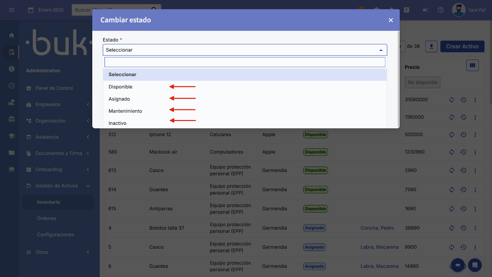 Selecione o novo estado: Disponível, Atribuído, Manutenção, Inativo