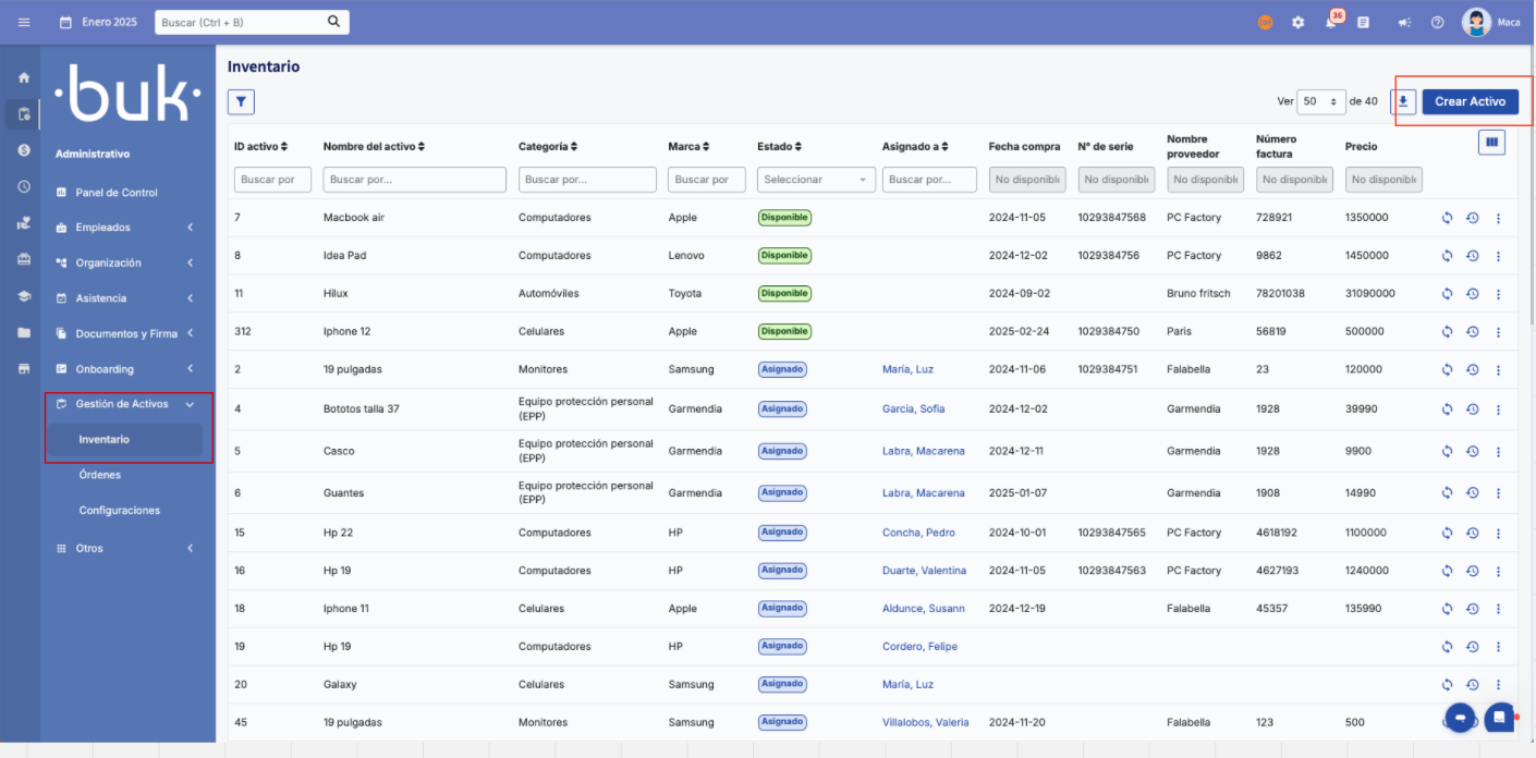 - Disponível:Estado quando o ativo está disponível para ser atribuído a um colaborador
