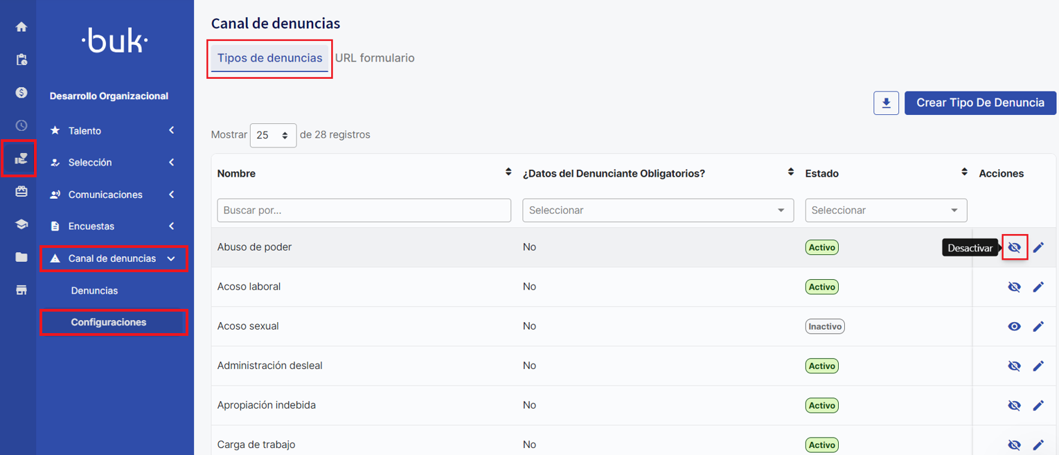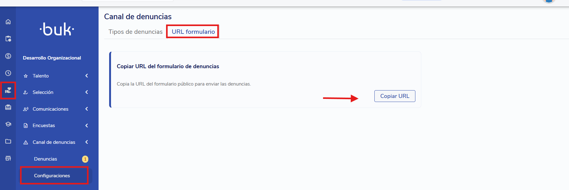No menu lateral, selecioneDesarrollo Organizacional, clique emCanal de Denunciase entre na abaConfiguraciones.