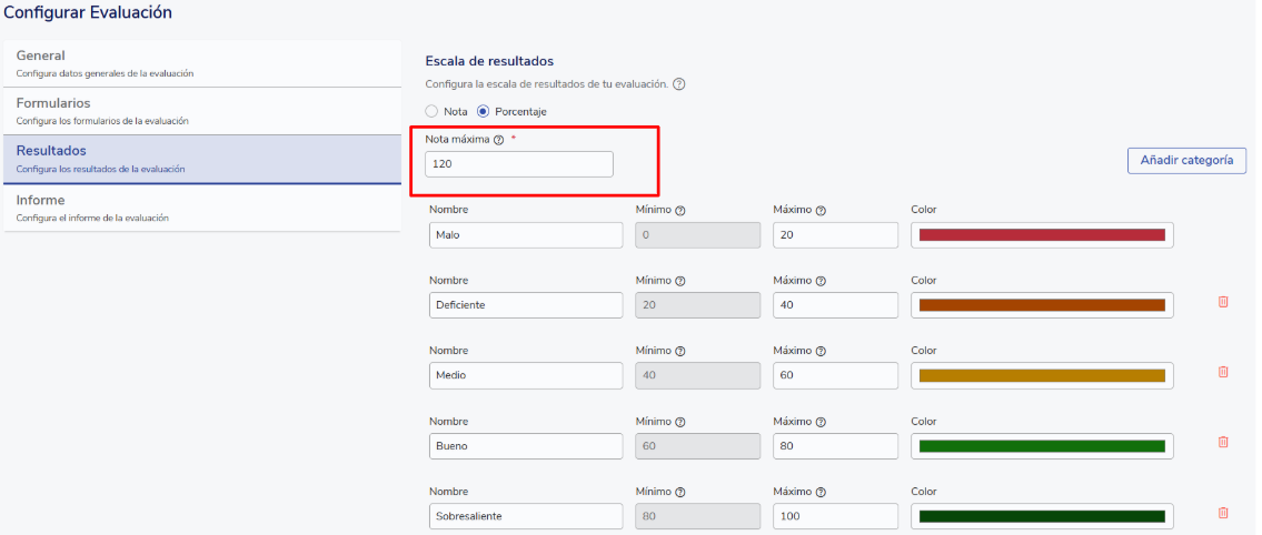 aumentar o valor máximo da escala de resultados não permite distinguir numericamente o sobrecumprimento, mas apenas redefine qual é o novo valor considerado como 100% na nota final.Considerações importantes