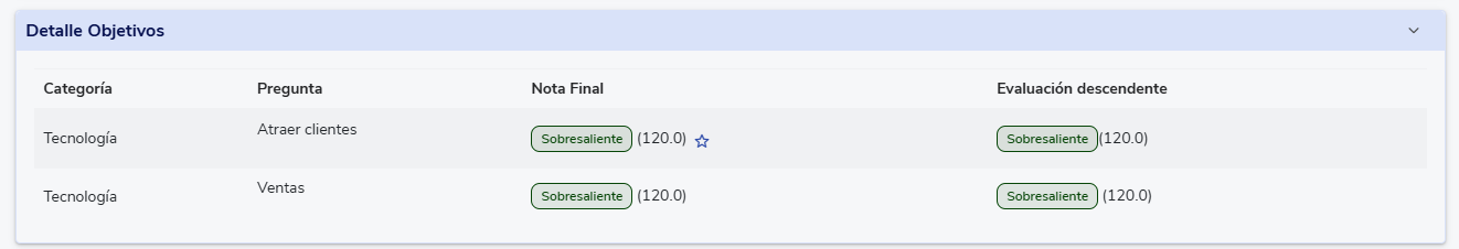 - Um colaborador obtém em um objetivo um avanço de 100% e em outro supera a meta, alcançando 120%.
