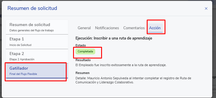 - Uma vez aprovada, o Workflow executa a ação final “Inscrever em uma trilha de aprendizagem”.