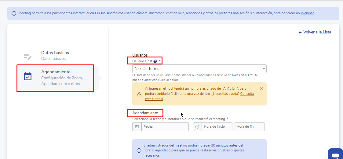Este artigo foi projetado para orientar os usuarios com rol de súper administrador e administrador na criação de um curso tipoMeetingdentro do LMS. O objetivo é instruir sobre o passo a passo requerido para configurar corretamente um curso síncrono com todas as suas informações, agendamento e instâncias, incluindo a asignación de un relator y participantes.
