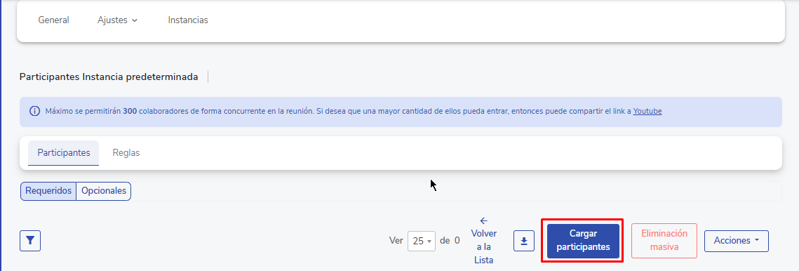 A partir da aba de Instancias, clique no botão "Participantes" e depois em "Cargar participantes". Lá você poderá inserir os identificadores (RUT o DNI) dos colaboradores que deseja inscrever.