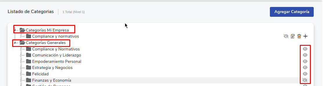 - Enquanto emCategorias Gerais, constam as que vêm com o LMS por padrão e só é possível configurar sua visibilidade (com o ícone