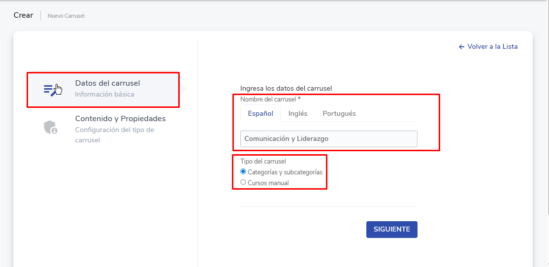 - Nome do carrossel: você pode personalizar o título nos idiomas disponíveis (espanhol, inglês, português).