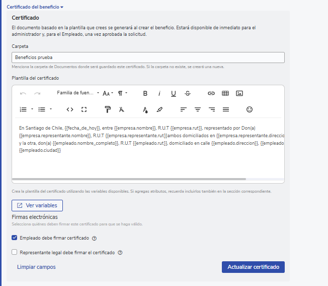 Como configurar um certificado de beneficios?