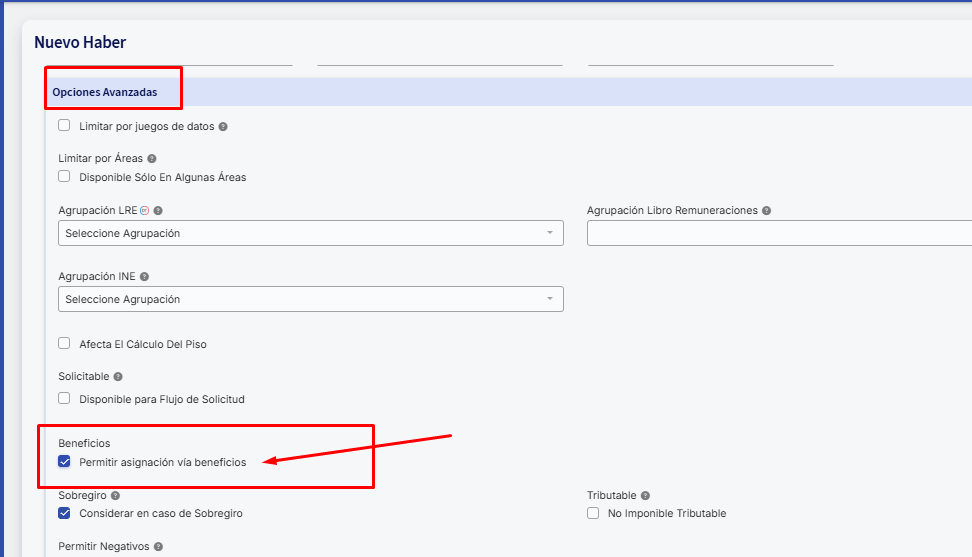 Para criar um benefício que esteja integrado com Remuneraciones, primeiro você precisa criar o haber. Dirija-se à barra lateral esquerda enRemuneraciones>> Ítems>>Haberes(Lembre-se que da mesma forma você pode criar benefícios integrados com Descuentos e Informativos caso seja necessário). Uma vez que o tenha criado, certifique-se de habilitar a opção de"Beneficios - Permitir asignación vía beneficios"em Opciones Avanzadas.