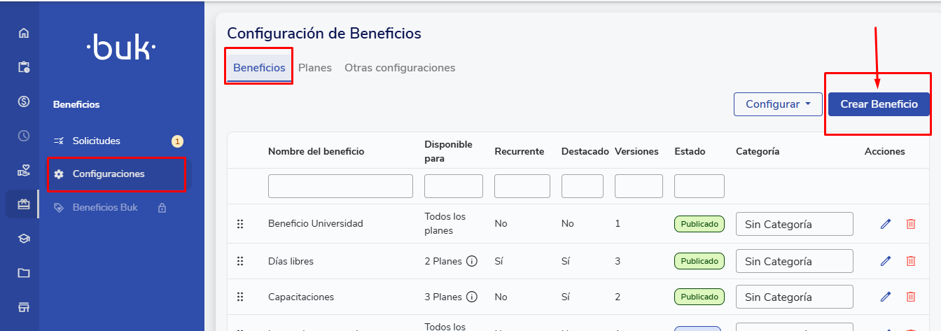 Uma vez creado el haber, deberás ir a crear tu beneficio de manera habitual desde la barra lateral izquierda, Beneficios>>Administración>>Crear Beneficio