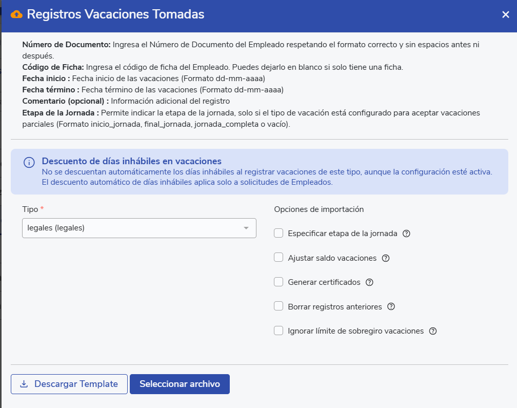 Além disso, você poderá baixar o template, onde deverá selecionar o tipo de férias que deseja registrar para o colaborador