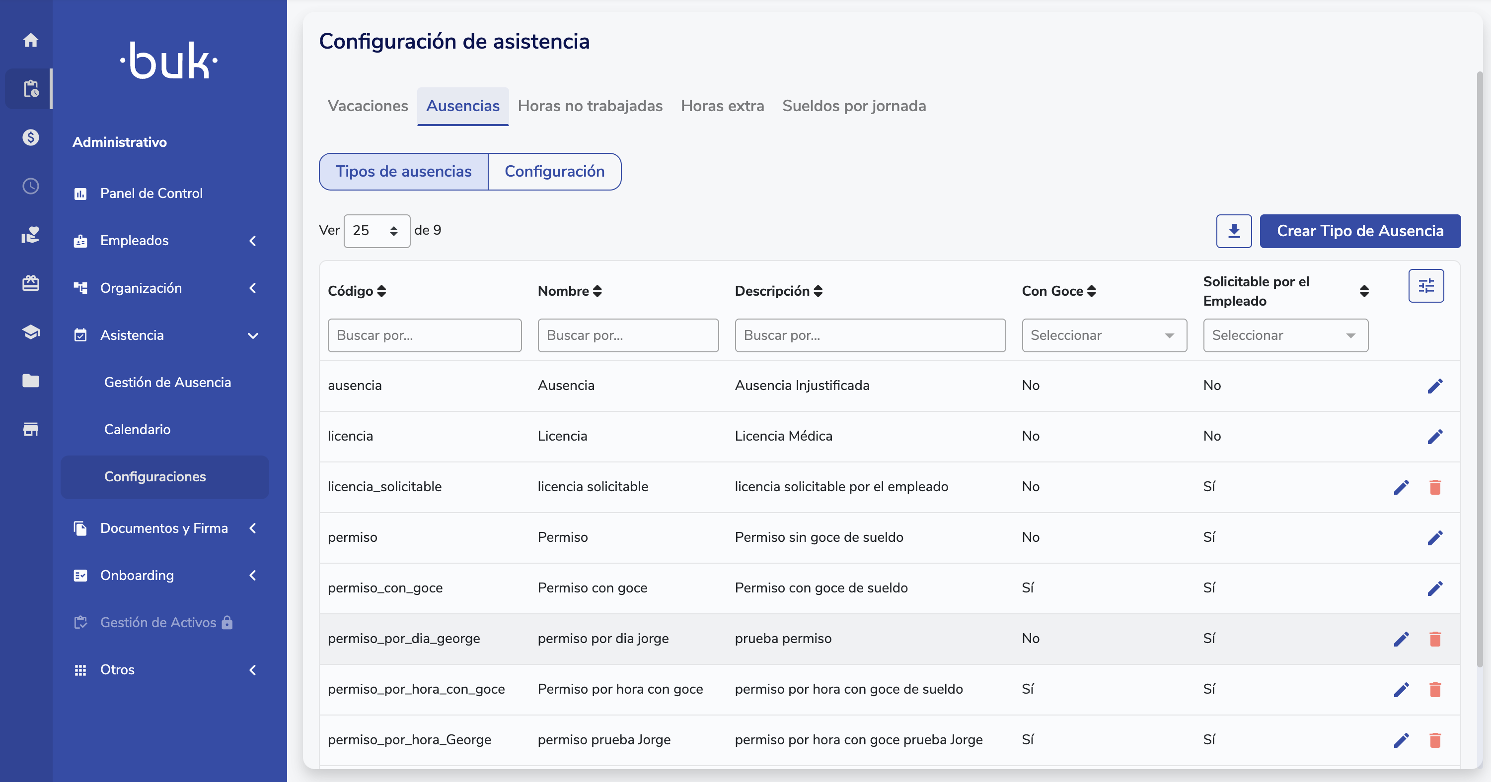 Uma vez em tipos de ausencia é possível criar/editar ou eliminar tipos de ausencia como "Permisos"